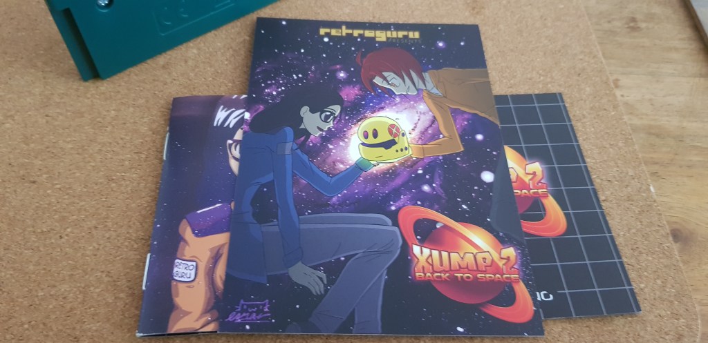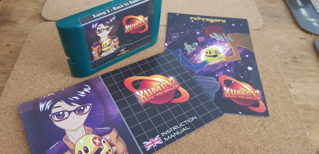 Before we dive into the game itself it is worth us having a quick look at the box art and what is inside. Xump 2 is modelled after classic Mega Drive titles of old and will look great on the shelf. It has that retro feel that collectors are after and publisher, DragonBox, has achieved an authentic look. The contents are much what you would expect containing a cart and instruction manual. The instructions are in English and German and the cart is sporting a racing green colour. The package looks really cool and although the manual is a little bare it has everything you need to get started. As an added bonus a postcard is included to please you collectors out there.