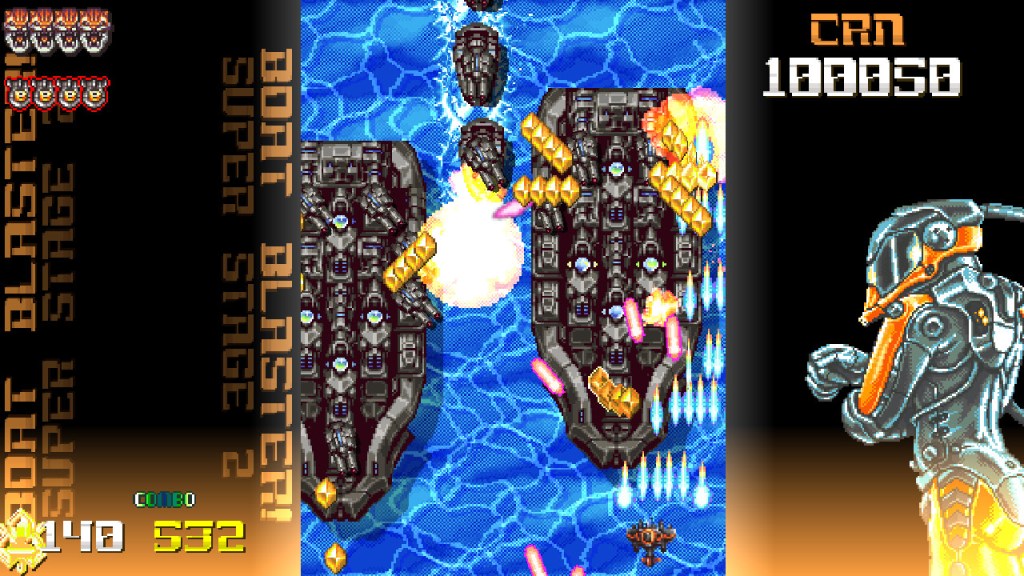 An important aspect of any shmup is its scoring system. Super XYX keeps this simple with points for chaining attacks into combos and collecting medals. The more you chain and collect, the bigger your score. At the end of each level bonuses are awarded for your total combo and medal count as well as lives left. Enemies will drop bigger medals if you destroy them in combination there is an end of level award for getting all enemies. This system is great for high score junkies and those that love to see those huge numbers. However, the system is easy to crack if hard to master so this effects longevity.