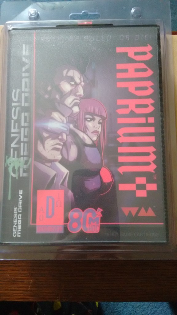 On the rear of the case it again has the Paprium logo in bright pink with the games tag line “Rule, Be ruled or die!” There is more graffiti which now states show 16bit respect.