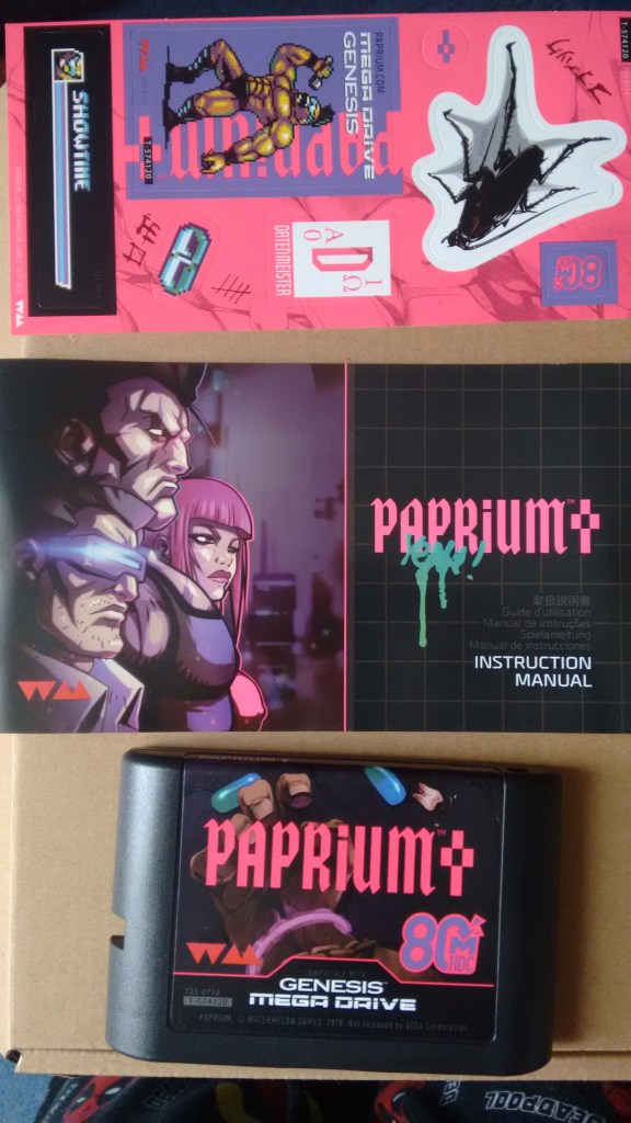 I break another seal which was on the case to open the case proper, In side on the right hand side contains the Paprium cartridge, next to it is the water melon logo which is embossed into the case, on the right hand side contains a manual, set of stickers and a poster/map. The stickers are bright pink and purple with flashes of white which have the Paprium cross logo, the datenmeister chip and 80 Meg logos a Blu pill graphic a cockroach and 2 stickers of showtime a character/enemy from the game who also appeared in a live action form for a Paprium video, one is a sprite of the character and the other is a health bar.