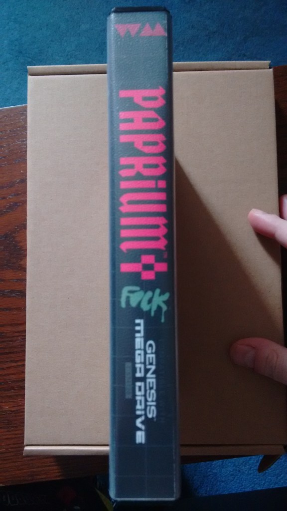 Finally inside the cardboard box there is a piece of folded paper which contains “Fonzie’s Manifesto” all I have to say its something where its a mix of lambasting people who backed the game to self aggrandising to even telling people to resell the game at a majorly inflated price. With a small addendum section about the game. He also takes a few pot shots over people who play on modern televisions compared to CRT. Later sections he complains about PayPal stealing his Paprium money. He then makes from very inappropriate comments at the very end which comes off as crass and slightly unhinged.