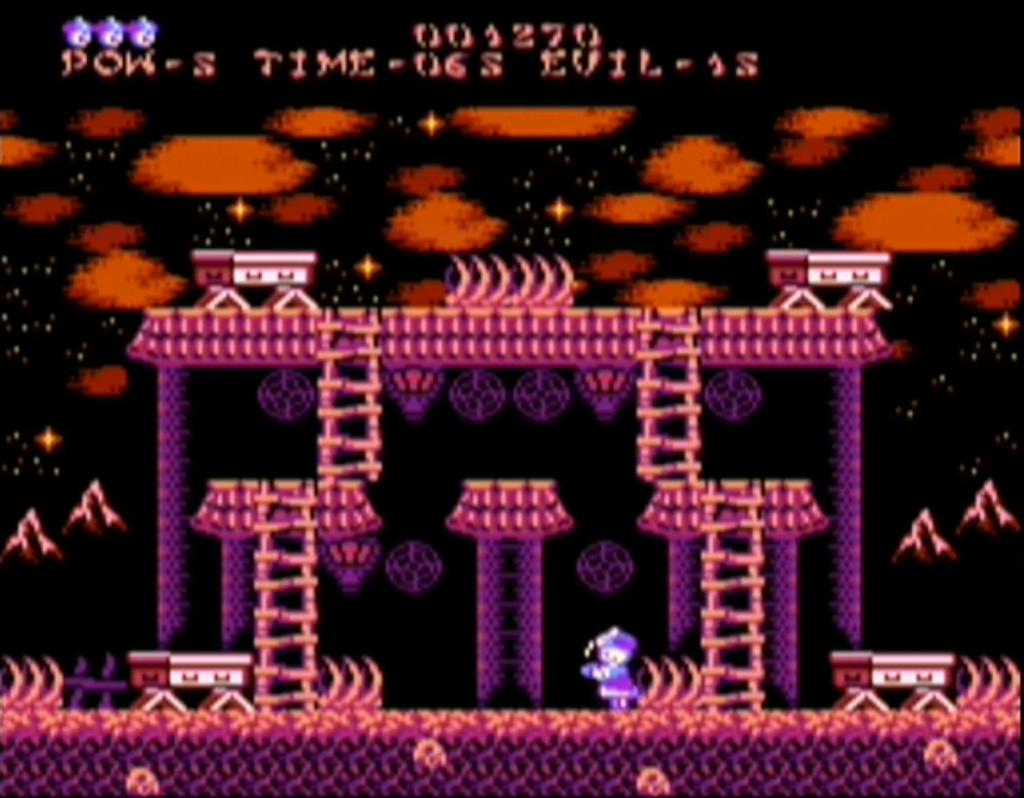Each level is timed with a set number of ghoulish nasties to destroy before the timer depletes. You will need to use the ladders that make up each level to get to the enemies that spawn randomly throughout the stages. There is never more than three enemies on screen at once although there is an evil eye that continuously hunts you down. The evil eye does not count towards the slaughter count but can be destroyed as well as damage you. Taking it down is not needed although at times you will end up whacking it to clear your path.