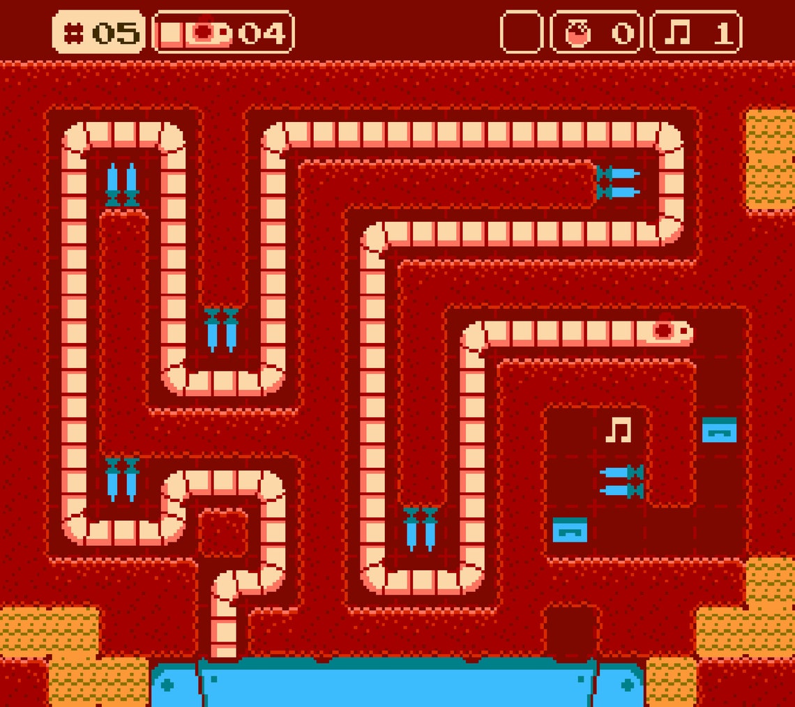When I started my journey with this one it felt as if Snake had been thrown into a turn-based puzzler. The standard levels are very much a classic sliding puzzle with some obstacles and useful objects added. You are a tapeworm in the literal sense. You worm your way out from a cassette and each movement up, down, left or right costs one movement point. These movement points come to represent your length, each square increases your size by one. You are always connected to the cassette at the bottom of each level although you can choose where to start your worm from one of two entrances.