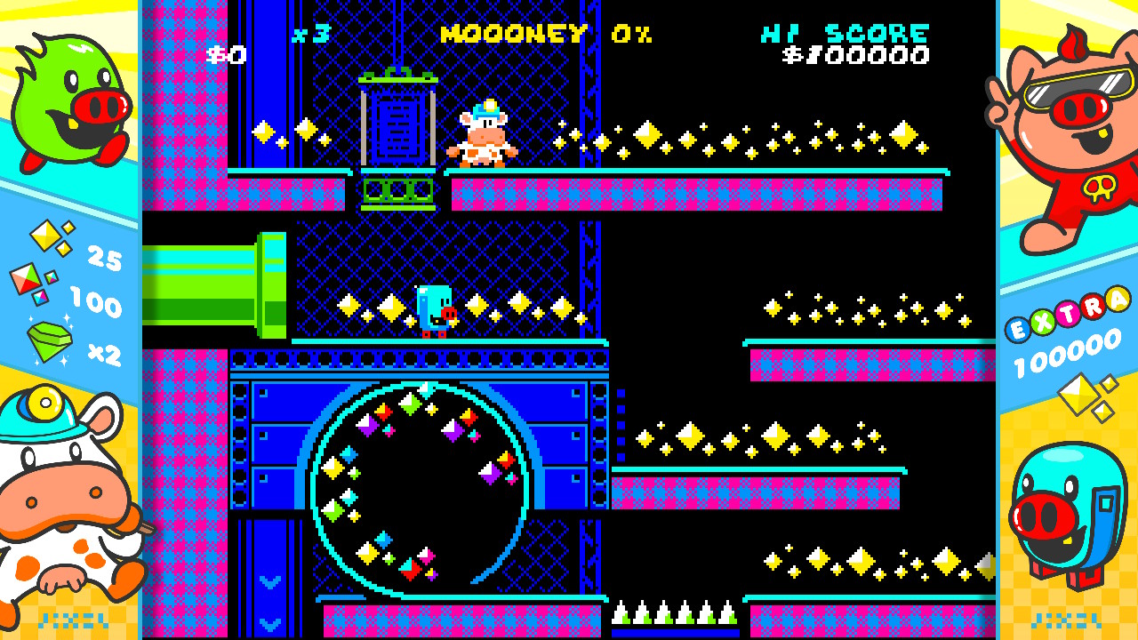 Cash Cow DX’s graphics are, as one might expect for this genre, heavily pixel art influenced, but with some of the jagged edges rounded off a little, making the game look a little like it’s from a parallel universe that had slightly superior tech. but still 40 years in the past. As per the arcade platforming classics of the 1980s, and indeed, the aforementioned Donut Dodo, the game is populated by charmingly designed cartoonish characters.